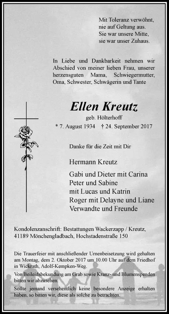 Ellen Kreutz wurde am 7. August 1934 in Solingen geboren. Sie war die Tochter von Willy und Lucy Hölterhoff und wuchs gemeinsam mit ihren Geschwistern Vera, Heini, Willy, Fritz und Manfred auf. In dieser großen Familie wurden schon früh jene Werte geprägt, die sie ihr ganzes Leben begleiteten: Ehrlichkeit, Dankbarkeit, Respekt und Bescheidenheit.